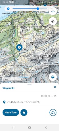 Topografische Karte mit dem Wegpunkt fürs Parken Ihres Fahrzeuges. Bitte beachten Sie, dass die Strasse ab Axalp gebührenpflichtig ist. Eine Vignette können Sie beim Shop auf der Axalp oder unterwegs auf der Axalpstrasse im Restaurant Bramisegg kaufen.